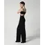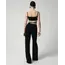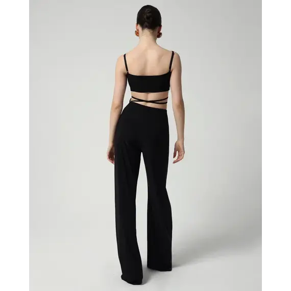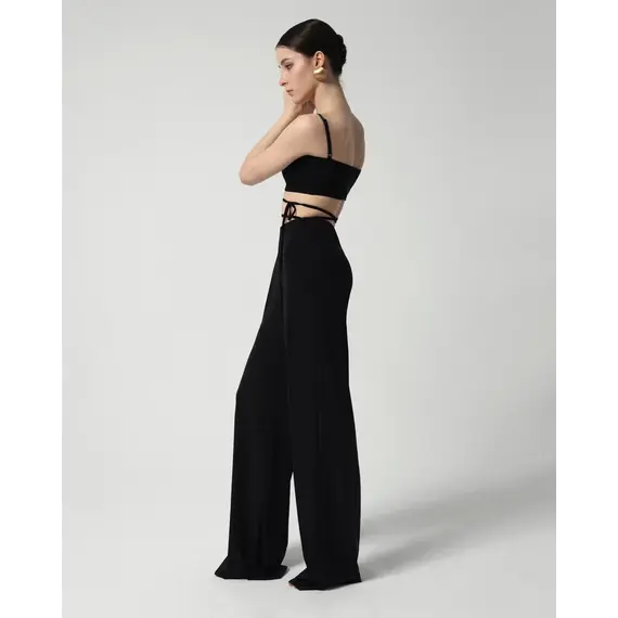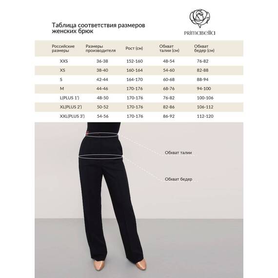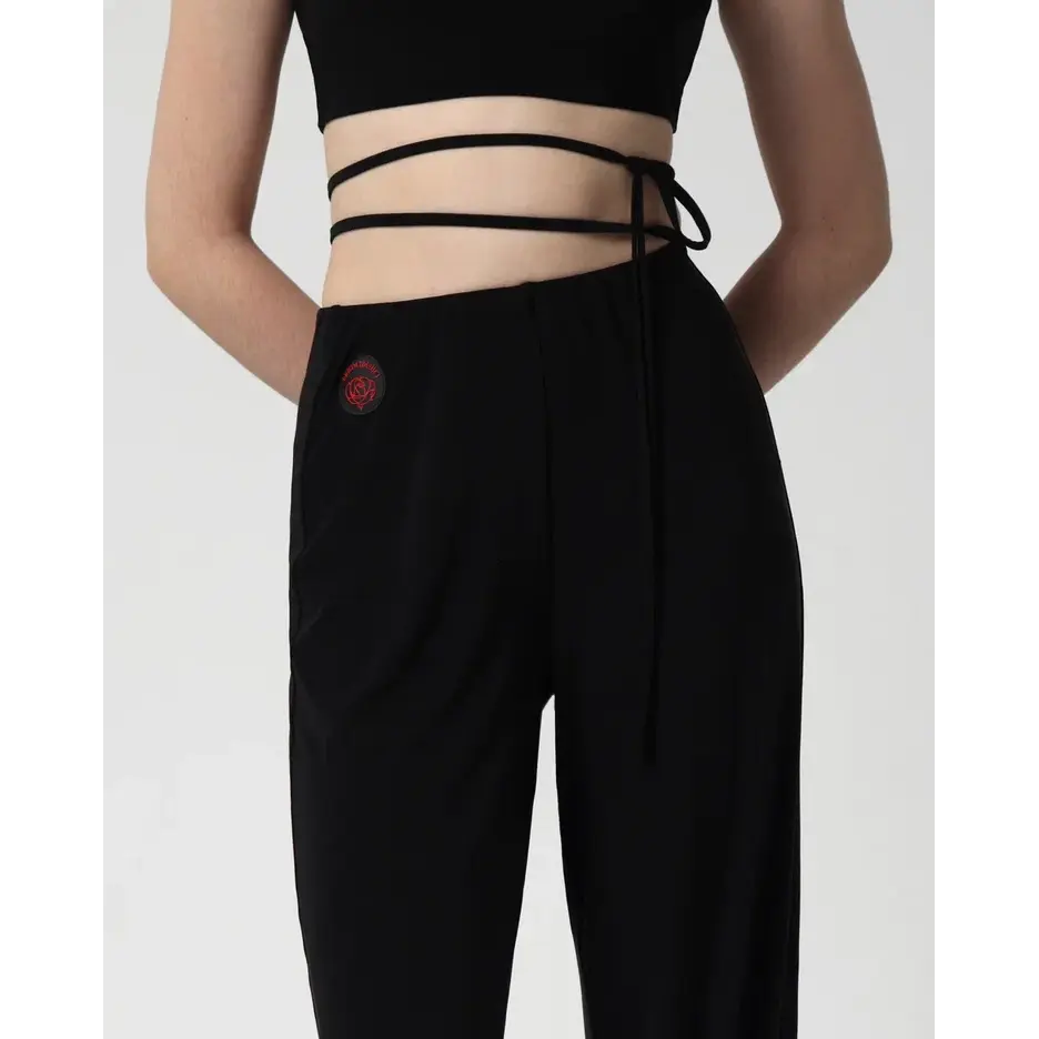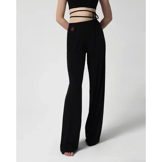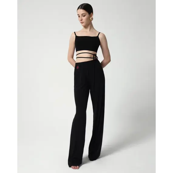 Пояс оснащён тонкой скрытой резинкой и дополнительной фиксирующей вставкой в боковом шве, обеспечивающей стабильную и комфортную посадку. В комплект входят резинки для ног, которые помогают удерживать брюки при амплитудных движениях и поддерживают аккуратную линию низа. Брюки легко сочетаются с топами, боди и тренировочной формой, создавая функциональный и стильный танцевальный образ.