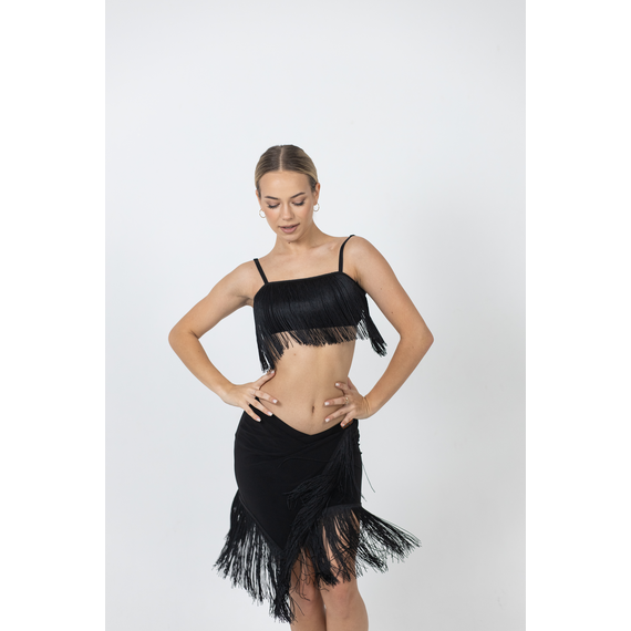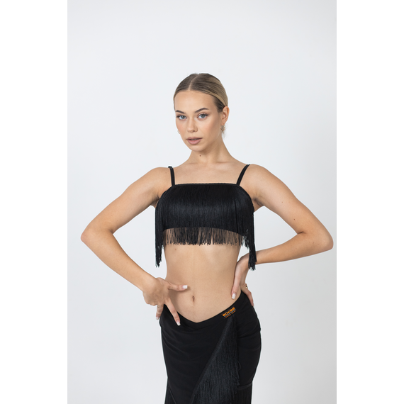Эластичный танцевальный топ с бахромой выполнен из трикотажа. Лиф по типу бюстгальтера оснащён чашками (без пуш-ап), регулируемой застёжкой на крючках и бретелями, длину которых можно корректировать. Топ обеспечивает комфорт и поддержку при тренировках, репетициях и сценических выступлениях, подчёркивая движения при танце. Универсальный крой легко сочетается с разными костюмами и аксессуарами.