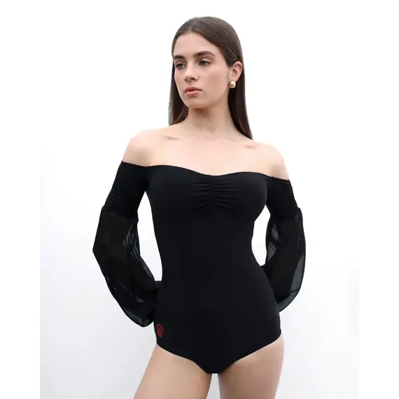 Боди Operto с вырезом бондо и воздушными пышными рукавами объединяет элегантность, лёгкость и современный стиль.