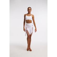 Юбка с драпировкой и закрытым регилином, визуально удлиняющая силуэт. Эластичный пояс и вшитые трусики обеспечивают комфорт и надежную посадку для активных танцев.
